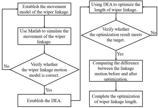 A flowchart of our method is shown in Figure 3. In this section, we will discuss a kinematic model of CDLS. On the basis of this model, mathematical formulas for the angles, the angular velocities, the values of angular acceleration, and the transmission angle of various parts of a CDLS will be established. Numerical simulations of the motion of a CDLS will be performed on MATLAB based on these mathematical formulas. The objective function is defined as follows: