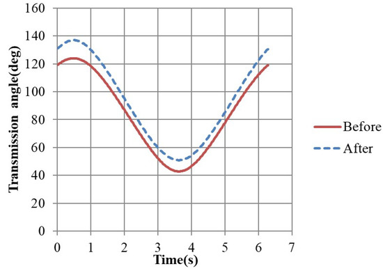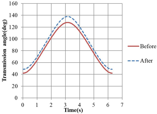 The transmission angle of the passenger side output-link of CDLS before/after DE optimization.