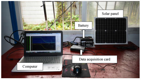 The pipeline leakage experiment system as shown in Figure 2 is built. The leakage simulation system is shown in Figure 3, and the acquisition equipment is shown in Figure 4. The pipe is supplied by connection to an external water supply pipe. The pipe material is Q235B steel, the inner diameter is 80 mm, and the pipe wall thickness is 3 mm. To simulate a leak, the faucet can be opened quickly. The pressure signal is collected by a high-frequency dynamic pressure sensor with a range of 0~0.6 MPa. The battery is charged via a solar panel to power the sensor. The data acquisition card is used to collect the signal of the sensor and transmit it to the computer. The signal sampling frequency is 2 kHz, and the pressure in the pipeline fluctuates between 0.16~0.24 MPa. When the pipeline pressure drops by more than 0.1 MPa in a short time, a leak is considered to have occurred. The 3 valves used to simulate leakage in the pipeline are fully opened, half-opened, and then closed in turn, with signal data received from the two pressure sensors.