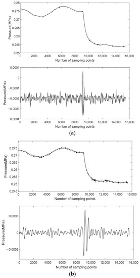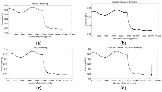 Figure 7a shows wavelet denoising, Figure 7b shows module maximum denoising, Figure 7c shows VMD denoising, and Figure 7d shows improved module maximum denoising. It can be seen from the denoising results of each method in Figure 7 that the improved module maximum denoising proposed in this paper achieves the best denoising effect while preserving the original signal characteristics as much as possible. It causes a spike at the stop point of the signal due to local extreme points, because there is no subsequent signal for scale iteration, and scale preservation cannot be performed. According to the denoising effect shown in Figure 7, it can be seen that the improved module maximum denoising can best retain the original signal, suppress the noise signal. It can more truly reflect the detailed changes of the original signal, especially for the detection of pressure abrupt points caused by NPW. Our method can retain the characteristics of the peak signal at the inflection point in the one-dimensional sequence with almost a straight drop of press, which provides a basis for the accuracy of extracting the singularity (inflection point), by wavelet decomposition. The SNR of the four methods is as follows: VMD is 40.87, wavelet threshold is 43.90, module maximum is 44.01, and improved module maximum is 50.97. It also further illustrates that the denoising effect of the proposed method in this paper is better than the other three methods.