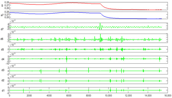 Wavelets have the role of a “mathematical microscope”, which can make the characteristics of abnormal information of the pressure abrupt point, caused by pipeline leakage, more clear. According to the experiment, we found that the number of wavelet decomposition layer is 7, as shown Figure 8. S is the NPW signal after denoising, and a7 is the low-frequency signal part after decomposition. The high frequency part d is the description of the signal change. The more the signal changes, the greater the value of d, and vice versa. At that position, it can be seen from Figure 8 that when the number of decomposition layers is 7, the pressure drop inflection point of NPW can be well captured. In the NPW signal, the low frequency part describes the details of the signal, and the high frequency part describes the change of the signal. The more drastic the signal change, the greater the value of the decomposition layer, and vice versa. In the position of the signal mutation, the coefficient after the wavelet transformation has a module maximum. Therefore, the wavelet detail feature is similar to the first-order differential, which is called the differential feature of the wavelet detail.