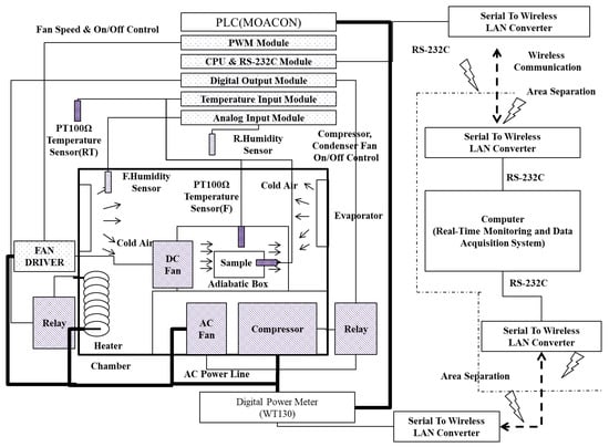 To measure and verify the data, an FD-170-SF cryogenic freezer (Unique daesung, Sungdong-gu, Seoul, Republic of Korea) was modified and used, as shown in Figure 1. The equipment added to control environmental variables and to obtain data from designed test cases was as follows: A MOACON PLC (Compile technology, Guro-gu, Seoul, Republic of Korea) was used for programming control, and a D12E-24PH (Nidec, Muko-shi, Kyoto, Japan) BLDC fan was used for air volume control. A CSW-H80 (Sollae system, Michuhol-gu, Incheon, Republic of Korea) was used to convert and transmit RS-232C communication to Wi-Fi, and an ePS80WL (Fujitsu, Minato-ku, Tokyo, Japan) power supply was used to variably supply BLDC fan power. To measure electrical energy, a WT130 (Yokogawa, Musashino, Tokyo, Tokyo) was used.
