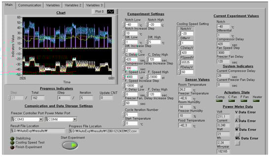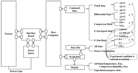 The electrical energy result data linked to test cases needed to be configured as a set in order to obtain data for machine learning. The test case was configured by adjusting the software variables of the controllable parts in the freezer to various parameters. As shown in Figure 2, control and setting parameters were divided into a total of five parameters. The “notch step”, the control temperature parameter of the freezer, was divided into −20, −30, and −40 °C, and the “differential step”, the hysteresis of the temperature control, was divided into 1.0, 3.0, and 5.0 °C. The “compressor delay time”, a parameter that forcibly delays the compressor after the operation is stopped, was divided into 420 and 720 s. In addition, the “freezer fan speed step”, a parameter related to the speed of the BLDC fan, was divided into 3000, 13,000, and 23,000 steps, and “freezer fan delay time”, a time parameter that forcibly prevents the fan from turning on again after stopping was constructed by dividing the steps into 0, 60, and 120 s. If the detailed steps of these parameters are combined, 162 test cases can be configured. All test cases were placed in a random order by the test automation program, and the beginning and end of each test were conducted by the “optimal method for reducing the measurement time” [18]. After completing 162 tests, 75% of the obtained data were used for training, and the remaining 25% were used for verification.
