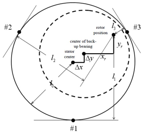 where is the magnetic permeability of the air, A is the pole face area, l0 is the nominal air gap, (xr, yr) is the position of the rotor center, and is the deviation of the back-up bearing center from the stator center. The origin of the inertial coordinate system is set to be the center of the back-up bearing since it can be easily calibrated. Next, we assume that , where is the actual magnetic flux at each pole, is the theoretical magnetic flux based on the assumption of uniform magnetic properties, and represents the non-uniformity of the magnetic fluxes. The theoretical magnetic fluxes can be obtained from the magnetic circuit analysis as: