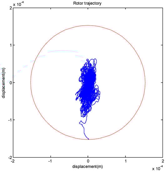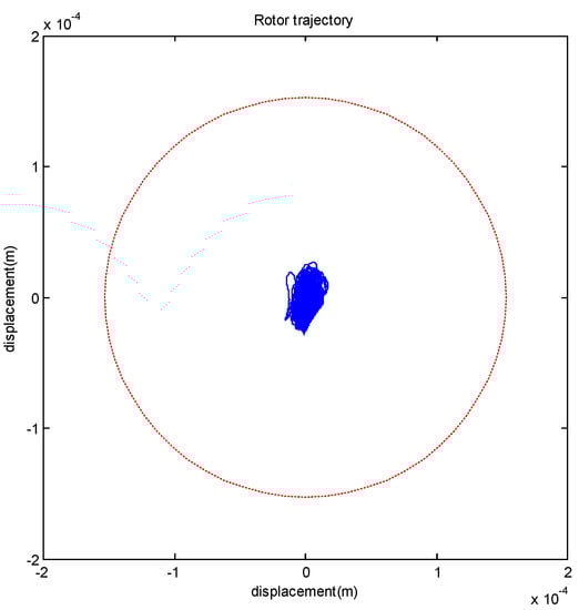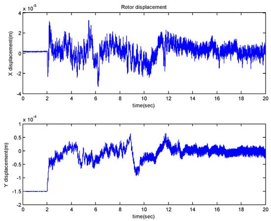 In Figure 8, one can observe high frequency vibrations and some “irregularity” in the rotor response. The “irregularity” shown in Figure 8 is mostly in the transient period (before 15 s), which could be due to the un-modeled higher-order dynamics. As shown in Figure 7, the high-frequency vibrations at the steady state period (after 15 s) are confined within about 20 um, which are due to sensor noise. Thus, it is clear that the proposed controller can stably levitate the rotor with strong non-uniform flux distribution and assembly errors. This is also confirmed by the rotor trajectory shown in Figure 6. In summary, both simulation and experimental results indicate that the rotor can be levitated to the center of the back-up bearing. These results verify the effectiveness of the proposed stable-levitation controller.