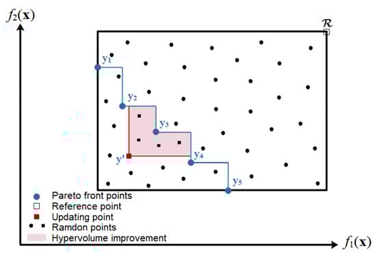 In Equation (9), one must notice that the hypervolume is equivalent to the region, which is dominated by at least one point of and itself dominates the reference point, as shown in Figure 1, shaded with blue oblique lines.