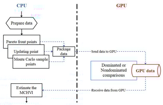 In this section, GPU implementation is presented for computing the value of the MCHVI indicator. As described in Algorithm 1, a mass of independent arithmetic operations associated with the dominated or non-dominated identifications (see Algorithm 1, line 6) are proved to be time-consuming. Fortunately, such tasks are mostly weak-dependent compute-intensive and are very suitable for GPU parallel architecture [39,40,41]. Therefore, such a kind of computation is implemented on the GPU to achieve acceleration. In order to obtain a global view of our implementation, the corresponding general framework of the program is given in Figure 4. It should be noted that necessary computing data, including the coordinates of all Monte Carlo sample points, Pareto front points, and updating points, are designed to be prepared on the CPU side and then sent to the GPU side before starting the GPU calculations. After all the calculations of the GPU side are finished, the total number of sample points that satisfy the definition of the MCHVI indicator is fetched (see Algorithm 1, line 6), and then sent back to the CPU side for the MCHVI estimation. That is, only time-consuming and suitable tasks are implemented on the GPU.