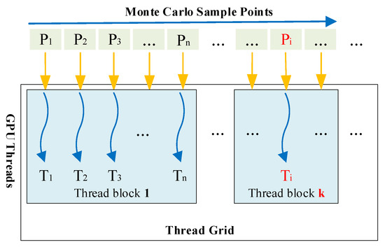 Algorithm 2 presents the key code snippet of the GPU subroutine for MCHVI calculations, in which MCSP_d is the number of Monte Carlo sample points, Front_d denotes the Pareto front, and HV_d is the computed MCHVI number nq (see lines 7 and 8 in Algo-rithm 1). The corresponding thread hierarchy is designed as shown in Figure 5. It can be learned that a GPU thread is assigned to the calculations related to each Monte Carlo sample point. All GPU threads are organized into a queue of thread blocks inside a thread grid to be adjusted to the double-layer structure of GPU hardware [42]. In the corresponding code snippet (Algorithm 2), the thread index is first calculated using three build-in parameters, , and (for details, see [42]). After the thread index is obtained, the locations of each Monte Carlo sample point (with the same thread index) are then compared with the existing Pareto front and current updating points. If the Monte Carlo point is located in the dominated region, an integer of 1 is added to the value of the MCHVI indicator using a build-in function of (see line 8 in Algorithm 2).