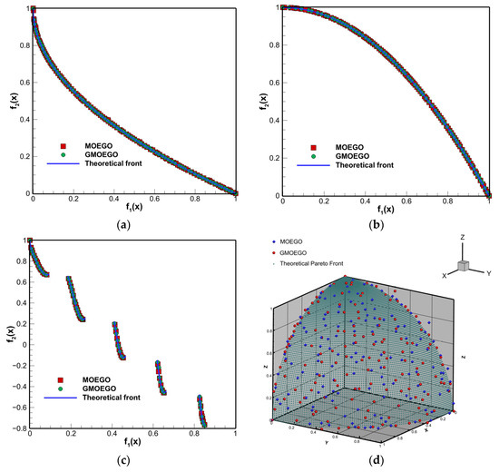 The test results are shown in Table 2. The Pareto solution distributions compared with the theoretical true Pareto front are illustrated in Figure 7. It can be noticed that, for all the test cases, the Pareto solution distributions obtained by the GMOEGO algorithm and the referenced MOEGO algorithm are very close to the theoretical true Pareto front, and the obtained IGD values listed in the third column of Table 2 are around to , which indicates the optimized Pareto fronts are very close to the theoretical Pareto fronts.