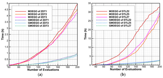 Wall-clock time history comparisons: (a) ZDT series functions; (b) DTLZ series functions.