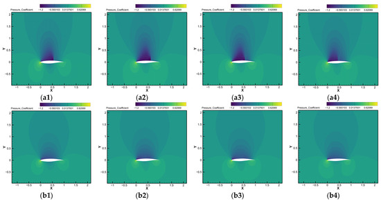 Contour of pressure coefficient comparison between optimized airfoil and baseline: (a1) Baseline of objective 1; (a2) Optimum 1 of objective 1; (a3) Optimum 2 of objective 1; (a4) Optimum 3 of objective 1; (b1) Baseline of objective 2; (b2) Optimum 1 of objective 2; (b3) Optimum 2 of objective 2; (b4) Optimum 3 of objective 2.