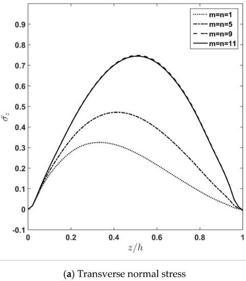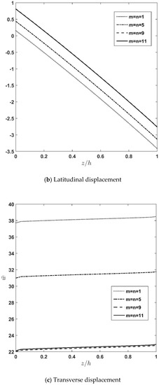 Through-thickness distribution of transverse normal stress, latitudinal displacement, and deflection of plate for different half wave numbers (m, n).