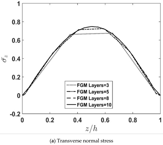- The maximum values of transverse normal stress are not at the mid-thickness of the plate, which is due to the FGM property.