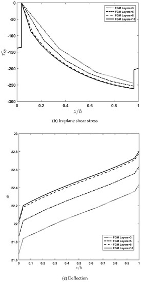 Moreover, the consequence of increasing the number of fictitious layers constituting the FGM part of the sandwich plate on the convergence of stresses and displacement along the thickness direction is presented in Figure 3a–c. Scrutinizing the diagrams shown in this figure reveals that increasing the number of fictitious layers for N > 10 has infinitesimal effect on their trend. In other words, considering N = 10 as the total number of fictitious layers guarantees the acceptable degree of stability for the applied solution. Accordingly, further computations in this research would be carried out by considering N = 10 as the minimum number of fictitious layers of FGM required for obtaining a stable rate of convergence.