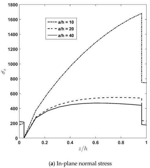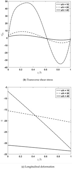 Figure 4a–d depicts through-thickness distribution of the axial normal stress , transverse shear stress , and deflection for different length-to-thickness-ratios . According to the figures and as expected, increasing causes a decrease in the stiffness of the plate, and accordingly, the stresses decrease. Moreover, it is seen that the rate of variation decreases by increasing the value of the length-to-thickness ratio. In other words, according to Figure 4a, it can be seen that increasing the value of from 10 to 20 causes the maximum value of the axial normal stress, , to change from 1692 to 544. Meanwhile, increasing the value of from 20 to 40 causes the maximum value of the axial normal stress, , to be changed from 544 to 427. Additionally, according to Figure 4b, it can be stated that increasing the value of from 10 to 20 causes the maximum value of the transverse shear stress, , to change from 48.129 to 8.352. Meanwhile, increasing the value of from 20 to 40 causes the maximum value of the transverse shear stress, , to change from 8.352 to 2.967.