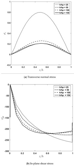 Effect of piezoelectric thickness variation on through-thickness distribution of dimensionless transverse normal stress, in-plane shear stress, and longitudinal displacement.