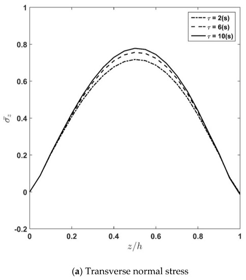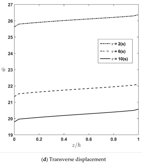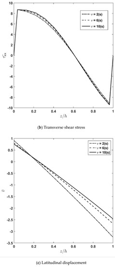 For different values of the relaxation time constant , the distribution of latitudinal and transverse displacements as well as transverse normal and shear stresses along the thickness are computed and plotted in Figure 6a–d. The figures show that increasing the relaxation time constant causes stress components to increase and displacement components to decrease due to the increase in the visco-elastic plate stiffness compared to the elastic one. Furthermore, it can be observed that the value of the relaxation time constant, , is more considerable in the trend of displacement terms compared to stresses. Additionally, one can observe from Figure 6a that increasing from 2 (s) to 6 (s) applies more significant impact on the transverse normal stress compared with the change made on the value of when changes from 6 (s) to 10 (s). Accordingly, it can be stated that converges to the constant value when reaches its upper bound. In other words, the effect of increasing on the transverse normal stress terms fades for higher values of .