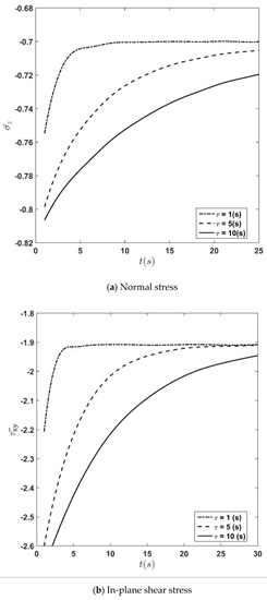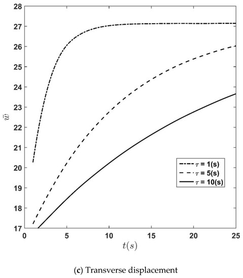 The time history of the stress and displacement components for different relaxation time constants is depicted in Figure 7a–c. The figures show that stress and displacement increase with time regardless of the value of and finally converge to their steady-state constant values. Moreover, it is seen that for all quantities for which their time history is depicted in this presentation, the rate of convergence to the ultimate values decreases when the time constant increases. From Figure 7c, it is seen that the influence of the relaxation time constant,, on the deflection is more significant compared to other quantities.