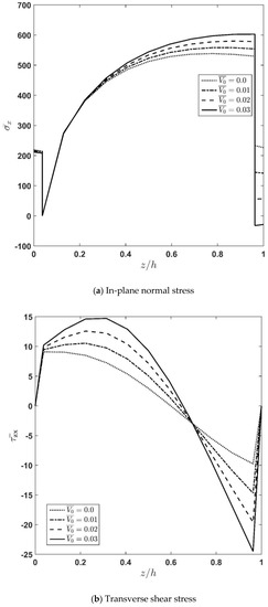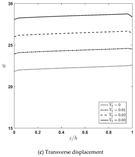 Figure 8a–c demonstrate the effect of the applied voltage,, on the variation of stresses and displacement along the thickness direction. According to the figures, increasing the voltage causes stresses and deflections to be increased. Moreover, it is seen that the effect of the applied voltage near the outer region of the FGM layer is more significant, which is due to the effect of the actuator layer. From Figure 8a it is observed that the normal longitudinal stress, , is discontinuous at two interfaces due to the different elastic constants at the interfaces. Additionally, it is concluded that by moving from the lower surface to the top surface of the sandwich plate, the sign of this stress changes from tension to compression. Moreover, one can say that the maximum value of the normal longitudinal stress has a linear-like relation with the intensity of the applied voltage. To clarify this matter, it can be mentioned that the difference between the value of at the interface between the core and the upper piezoelectric face-layer computed at = 0 and = 0.01 is almost equal to the difference between the mentioned stress computed at = 0.01 and = 0.02. As Figure 8b shows, the continuity of transverse shear stress at the interfaces as well as at the top and bottom surfaces are satisfied, and its variation at the bottom surface is almost negligible. Figure 8c indicates that the slope for is almost independent of the value, but an increase in the applied voltage causes the plate to experience an increase in deflection. Moreover, it is observed that the slope of the deflection curve for the actuator layer increases when the applied voltage increases.