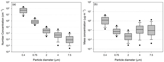 (a) Number and (b) mass concentration size distributions observed at each channel over the entire period. The bottom and top of each box represent the lower and upper quartiles, respectively, whereas the line within each box represents the median.