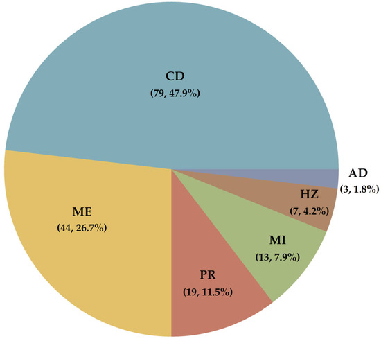 Based on the LPC observation data across the study period, hourly data for a total of 173 days were included in the analysis. If data loss affected >6 h·d−1, that day was excluded from the analysis. Figure 4 shows the frequency of occurrence on days where AD, HZ, MI, PR, multiple events (ME), and clear days (CD) were observed by the KMA. Among all the cases, the numbers of single-case occurrence days were 19, 13, 7, and 3 for PR, MI, HZ, and AD cases, respectively, and the physical properties of the aerosols were investigated for these cases. In this study, the analysis was conducted focusing on each individual meteorological phenomenon.