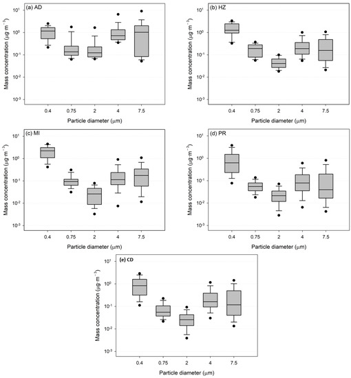 Median values ± MAD were used in the present study to effectively analyze the wide distribution of concentrations based on aerosol particle size. In the distribution of aerosol mass concentration by meteorological phenomena (Figure 5), the highest mass concentrations in coarse particle mode (>1 μm) were observed for AD, which were 0.124 ± 0.046, 0.722 ± 0.322, and 1.028 ± 0.944 μg·m−3 for particle size 1–3, 3–5, 5–10 μm, respectively. For the fine particle mode (<1 μm), the highest mass concentrations in the first channel observed were for MI (2.213 ± 0.950 μg·m−3), and the phenomenon of HZ showed the highest mass concentrations in the second channel (0.192 ± 0.106 μg·m−3). The lowest concentrations in the total channel were recorded for CD. The mass concentrations in the coarse particle mode (5th channel) were observed to be in the order of AD > MI > HZ > CD > PR, whereas the concentrations in the fine particle modes (1st channel) followed the order of MI > HZ > AD > CD > PR (Table 2).