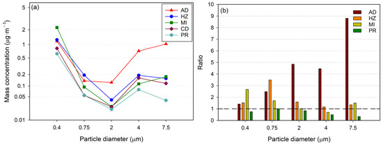 (a) Aerosol mass concentration size distribution for the AD, HZ, MI, PR, and CD cases. (b) The proportion of mass concentration for each phenomenon (AD, HZ, MI, and PR) by particle size compared with CD conditions (dashed line).