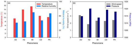 Meteorological factor distributions for each phenomenon: (a) temperature and relative humidity, (b) pressure and wind speed. AD: Asian dust, HZ: haze, MI: mist, CD: clear days, and PR: precipitation.