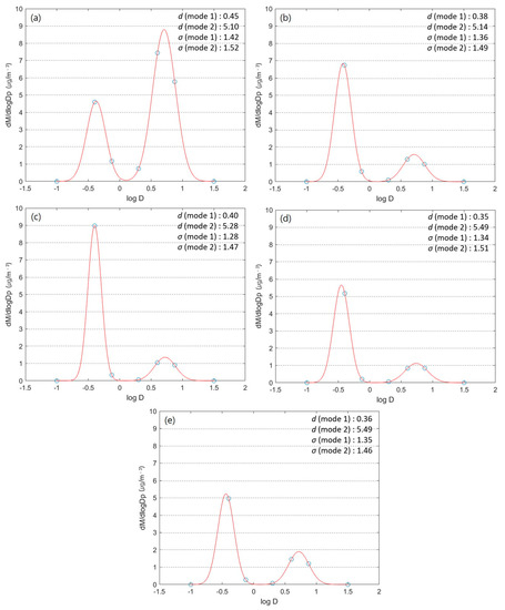 To statistically examine the distribution of mass concentrations according to particle size, two optimum lognormal distribution functions were used (Equation (5)):