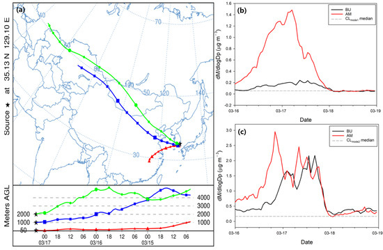 (a) Backward trajectory of air masses at 0400 UTC 17 March 2009 in Busan. Time series of aerosol mass concentrations in (b) Mode 1 and (c) Mode 2 at Busan (black line) are presented with those of Anmyeondo (red line) for 25–26 December 2009. The dashed lines are the median aerosol mass concentration for the CD cases in Modes 1 and 2, respectively.