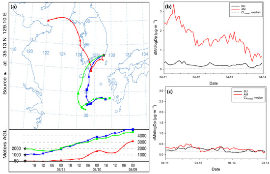 (a) Backward trajectory of air masses at 0300 UTC 13 April 2010 in Busan. Time series of aerosol mass concentrations in (b) Mode 1 and (c) Mode 2 at Busan (black line) are presented with those of Anmyeondo (red line) for 9–12 January 2009. The dashed lines are the median aerosol mass concentrations for the CD cases in Modes 1 and 2, respectively.