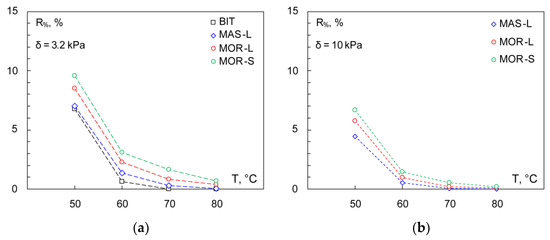 Then, the responses of the binder were finally evaluated in terms of rutting potential considering the high in-service temperatures to which the bitumen will be subjected. This was accomplished through Multiple Stress Creep Recovery (MSCR) tests (EN 16659) on 25 mm diameter samples (parallel plate DSR geometry—testing gap 1 mm). Three test replicates for each material and four test temperatures (50, 60, 70, and 80 °C) were analyzed. A pre-conditioning time of 15 min at the testing temperature was again selected. For BIT, the test protocol consisted of the application of consecutive creep-recovery cycles under different stress levels τ (0.1 and 3.2 kPa); in particular, 10 cycles constituted by 1.0 s of creep loading and 9.0 s of rest period were repeated for each of the two stress levels on the same sample. Binder performance was assessed by averaging the results of the three test replicates. At a generic nth cycle, εn0 is the deformation at the beginning of creep load application, εn1 is the strain after the creep phase of 1.0 s, and εn10 is the final strain at the end of the given cycle. Then, the R%τ parameter was used to express the average recovery aptitude of the material for the selected stress level τ (average of 10 cycles) according to Equation (1):