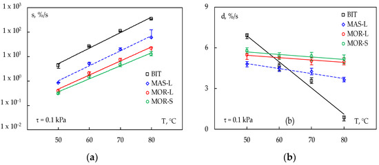Generally, quasi-negligible fluctuations of 10-cycle data among the mean values were detected (see error bars in Figure 8). As far as s is concerned, A parameter (curve position) seemed to be inversely related to the material stiffness; as expected, lower creep slopes were found for the stiffer material; this means that the stiffer MOR-S accumulate lower creep deformation at a given T and τ with respect to other materials (lower creep slope at the fixed duration time of 1 s). On the other hand, B coefficient (curve slope) was quite similar for each material and stress level, suggesting a quite similar thermal and stress dependency of the creep slope. As far as the delay d, the slope m (linear interpolation) was quite different depending on material and stress level. In general, the thermal dependency was reduced (lower m) when the material stiffness increased; on the contrary, the increase of stress led to amplified m.