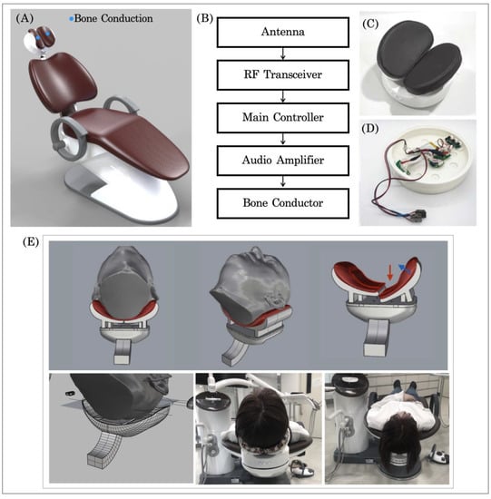Configuration and photography of unit chair with bone conduction speaker: (A) unit chair with bone conduction; (B) diagram of bone conduction speaker; (C) headrest of unit chair; (D) bone conduction speaker system; (E) double-sided headrest designed to wrap around the head using the weight of the user′s head.