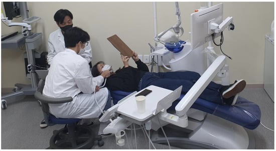 To determine the masking threshold (dB(A)) to be used in clinical trials, the noise level generated in high-speed mode (360,000~430,000 rpm) was measured. Noise was measured in a closed treatment room with a background noise of less than 40 dB and a minimum background noise, and was measured at an ideal treatment distance of 30.0 cm (Figure 2A) [].