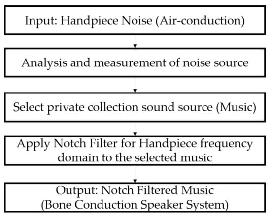 Dental handpiece noise can be directly controlled using active and passive noise control methods. By using passive materials to absorb sound and vibration, passive noise management is a technique for reducing noise (sound-absorbing and insulating materials). Applying the passive noise reduction method to dental handpiece noise management is challenging because passive materials need to be thicker and heavier []. Active noise control techniques are useful for reducing low-frequency noise [], but they are challenging to implement for high-speed dental handpieces []. The direct noise reduction method therefore requires extensive studies taking into account the complicated characteristics of the handpiece noise. There is research that demonstrates the benefits of playing music to patients in reducing noise and anxiety [,,]. Another study used music through speakers or a headset as a way to intervene in dental anxiety in patients []. However, various drawbacks were discovered in order for patients to receive indirect noise reduction effects, including the need for louder music than the sound of the dental handpiece, the need for the patients to wear headphones, and the disruption of patient and doctor communication []. In this study, we propose a sound masking technology specialized for dental handpiece noise to improve the psychological noise reduction effect through music. In the proposed system, a bone conduction speaker was mounted on the headrest so that the patient could listen to music immediately after lying on the unit chair, and sound masking technology was applied to the music to control the noise of the dental handpiece. The unit chair is a chair on which a patient can lie down to receive dental treatment and is equipped with various parts such as a dental handpiece and a dental operation light, but the possibility of using the headrest as a part of it has not been studied except for when the patient’s head is rested []. Sound masking is a process in which an initial sound (called maskee) is overlaid with another sound (called masker) that can eliminate its component to make it less recognizable, affecting the auditory nerve stimulation of a person. Sound masking has been investigated and applied from insulating private office rooms [] to masking industrial noise [], but none yet for the noise generated by the dental handpiece. Sound masking technology can be divided into simultaneous masking (SM), which is a frequency-domain masking, and temporal masking (TM), which is a time-domain masking []. SM is a method in which the maskee sound and the masker sound are presented at the same time to shield the maskee sound, and TM is a method in which the other sound (maskee) in front or behind is shielded through a sudden sound stimulus (masker). Because music can be used as a masker due to the characteristics of continuous sound, the SM method was applied in this study.
