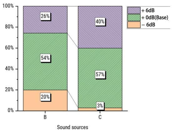 The effectiveness of the proposed system was confirmed through a survey. As shown in Figure 6, the patients preferred the volume of music (Sources B and C) to the dental handpiece noise level (base). Before the masking technology was applied, there were 20% of patients who preferred to listen to music at a low level (−6 dB), but after the masking technology was applied, only 3% preferred to listen to music at a low level. Overall, it was confirmed that people preferred to listen to louder music that is masked.