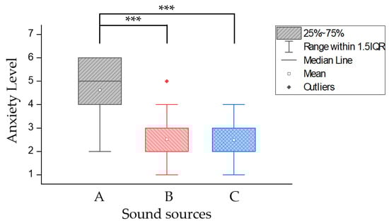 As shown in Figure 7, the patients felt an average anxiety level of 4.6 for Sound Source A, and an average anxiety level of 2.5 for Sound Sources B and C. As a result of statistical analysis using the Wilcoxon signed-rank t-test method, it was found that anxiety was reduced due to the psychological noise reduction effect when music was played to the patients (Sources B and C).
