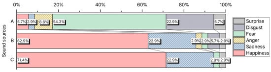 As shown in Figure 8, when the dental handpiece noise (Source A) was played to the patients, negative emotions were recorded to have the most response (fear: 54.3%), but when the preferred music and dental handpiece noise were played together (Source B), the emotion of the respondents shifted to better feedback as they changed to positive emotions (Happiness 62.9%). When the patients were subjected to listening to the notch-filtered music (Source C), happiness was recorded to be 71.4%; compared to Sound Source B, happiness was improved by 8.5%, and negative emotions were reduced.