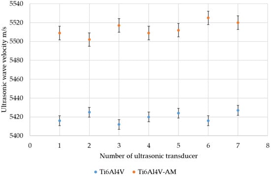The obtained values of the mean ultrasonic wave velocity in two different materials (shown in Table 1 and Table 2) were determined from 10 measurements for each ultrasonic head. A summary of the individual wave velocity values for each head is shown in Figure 2. Higher values of ultrasonic wave velocity can be seen for the material produced by additive manufacturing technology. The difference in wave velocity is equal to around 2%. It may be caused by the different densities of the material and the more compact structure for Ti6Al4V-AM, which is formed due to the melting of individual layers during the manufacturing process.