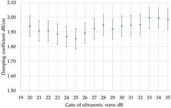 In the next stage of the research, the effect of ultrasonic longitudinal wave pulse gain on the damping coefficient values in the tested materials was verified. For this purpose, 10 measurements of ultrasonic wave parameters were made for 25 mm thick specimens. The amplitudes of the first two pulses obtained from the bottom of the sample were recorded, and then the value of the damping coefficient was determined (Figure 3). The damping coefficient was determined based on the relationship:
