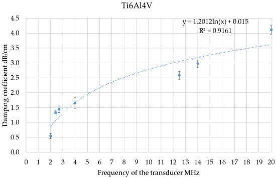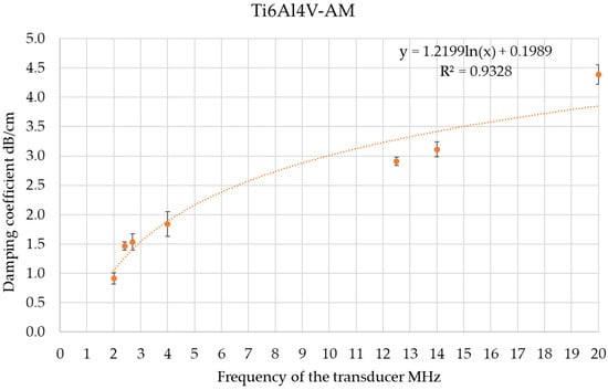 The damping coefficient results are similar for the Ti6Al4V-AM and Ti6Al4V materials. Nevertheless, higher damping coefficient values were always determined for Ti6Al4V-AM. The regression curve determined from the measurement results for different frequency values of the ultrasonic transducer has a similar shape, and the coefficient of determination R2 reaches values of 0.92 and 0.93, which indicates a very good fit of the mathematical model to the damping coefficient measurement results.