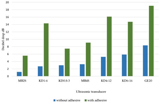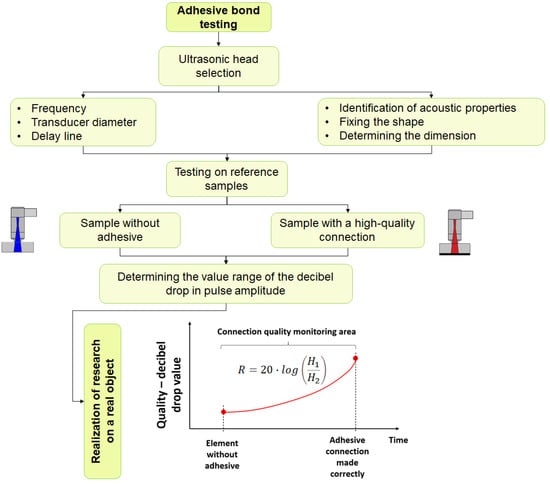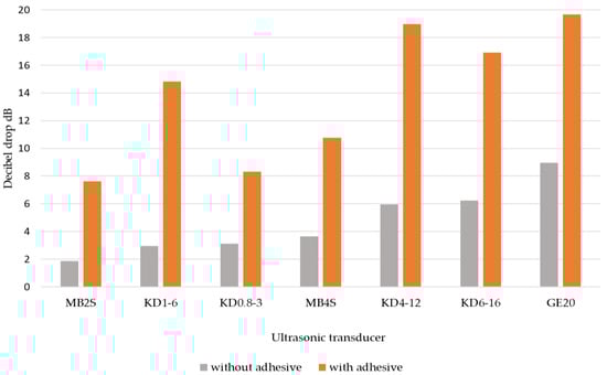 A 1 mm thick adhesive layer was applied to each sample. Before applying the adhesive, the surface of the sample was sanded with an abrasive disc and cleaned. The adhesive was applied at 20 °C and 50% humidity. Equal atmospheric conditions were maintained during the bonding of the adhesive to the sample surface. The setting time was about 24 h. Ultrasonic testing of the decibel pulse drop was then performed, as shown in Figure 6.