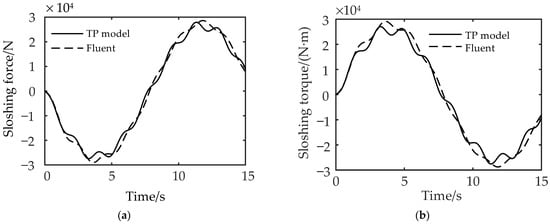 The Fluent software and the TP model are, respectively, used to simulate the sloshing force and torque generated by the liquid sloshing in the tank. The results are shown in Figure 2a,b.