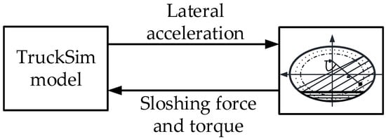 Considering the danger of the real vehicle test, a co-simulation model of the liquid tank semi-trailer is established based on TruckSim and MATLAB/Simulink, as shown in Figure 3. In this model, the lateral acceleration of the TruckSim model is input into the liquid sloshing model, and the liquid sloshing model outputs the force and torque generated by liquid sloshing to the TruckSim model [].