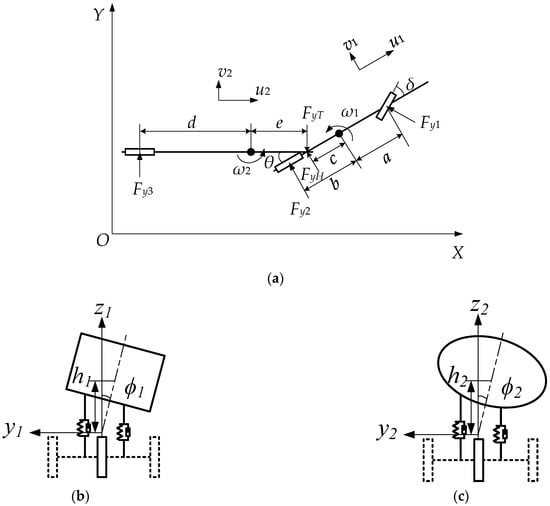 Schematic diagram of the liquid tank semi-trailer: (a) XOY plane diagram, (b) tractor roll model, and (c) semi-trailer roll model.