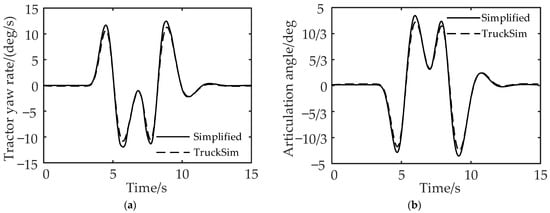 Comparison of vehicle state responses between simplified model and TruckSim model: (a) comparison of yaw rate of the tractor and (b) comparison of articulation angle.