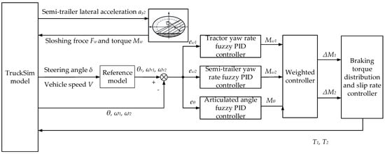 The general architecture of the yaw stability control method for the liquid tank semi-trailer is shown in Figure 7. The TP model calculates the force and torque generated by liquid sloshing, the TruckSim software provides the real-time state parameters of the vehicle, and the reference model provides the expected values of state parameters of the vehicle. The difference between the real-time state parameters and the stable state parameters is controlled by the tractor yaw rate fuzzy PID controller, the semi-trailer yaw rate fuzzy PID controller, and the articulation angle fuzzy PID controller, and the final additional yaw moment required by the tractor and semi-trailer is obtained after the weighted control of the above three. The additional yaw moment of the vehicle is provided by the braking torque of the wheels. Through the braking torque distribution and the wheel slip rate control, the braking torque of each wheel of the tractor and the semi-trailer is fed back to the TruckSim software to correct the state of the vehicle in real-time, to achieve the yaw stability control of the liquid tank semi-trailer.