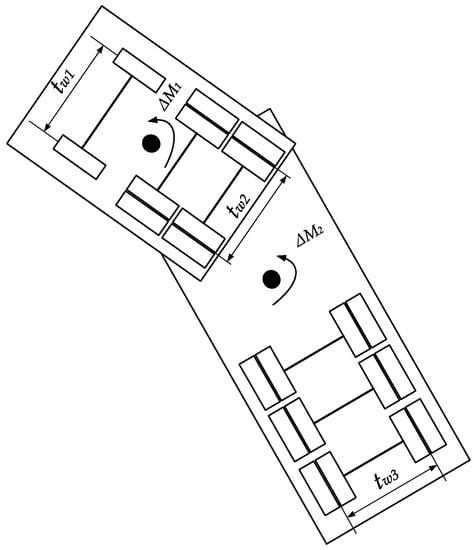 When the additional yaw moment required for differential braking of the liquid tank semi-trailer is calculated based on the multi-object PID controller, it is necessary to calculate the braking moment generated by the wheels of the tractor and semi-trailer , . The additional yaw moment of the vehicle is provided by the braking force applied to the wheels. Therefore, only by determining the relationship between the additional yaw moment and the braking force of different wheels can the braking torque be accurately calculated. Take the direction in which the vehicle turns left as the positive one and the other as the negative one. The relationship between the additional yaw moment and the braking moment of the liquid tank semi-trailer under the left-turning condition is shown in Figure 11.