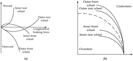 Braking characteristics of different brake wheels: (a) relationship between yaw moment generated by braking of different wheels and longitudinal braking force and (b) influence of single wheel braking on vehicle steering.